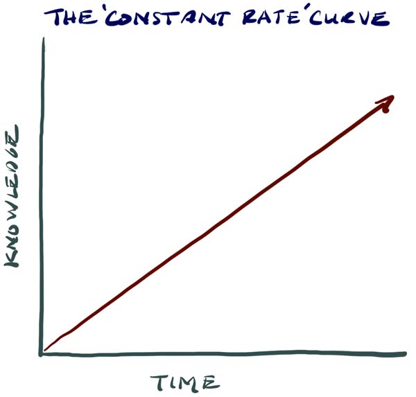 The result of eliminating the false assumption that subjects are finite is The Constant Rate Curve. If subjects are infinite, your learning curve no longer has reason to level off. At least as long as the knowledge left to learn is still useful. (We’re really talking about learning the six basic actions, and no matter how good you get at any of them, it will still be incredibly useful to get better.) When you are learning along The Constant Rate Curve, your experience is more like packing fruit at a fruit processing plant than it is like picking fruit off a tree. As long as the fruit trucks coming in from the orchards, you can keep packing it up as fast as the conveyor belt can deliver it. The knowledge you are gaining is the fruit, and your teacher is the conveyor belt delivering it from the trucks. You are only limited by the rate at which your teacher (or teachers) can deliver you the knowledge.