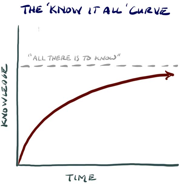 The Know It All Curve is the inevitable result of making the assumption that the subject you are learning is finite. When you are first exposed to a finite new subject all of it is new and it feels like you are learning very quickly. But over time you begin to master it. And as you get closer to knowing all of it, you run out of new things to learn. Your learning curve levels out and eventually you stop learning all together. When you are learning on the Know It All Curve, learning is like picking fruit from a tree. In the beginning, getting fruit it is very easy. But the more fruit you pick, the harder it is to get the next piece. And eventually you run out of fruit that you can reach.